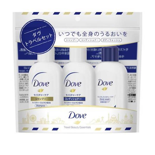 ●Dove ダヴ 全身うるおいトラベルセット ミニサイズ●いつでも全身のうるおいを。●シャンプー&コンディショナー&ボディウォッシュの3点トラベルセット。●セット内容:ダヴMシャンプーB・ダヴMヘアコンディショナーB・ダヴPMボディウォッシュD 各45g【ヘアケア(シャンプー・コンディショナー)】●2wayケアで健やかな美しさを呼び覚ます。モイスチャーミルクEX(うるおい成分)配合で、一日中続くうるサラ髪へ。●パサつき髪も毛先までうるおうダヴの2Wayケアで、髪の内側も外側もうるおいケア。健やかで、うっとりするようなうるサラ髪へ。【ボディケア(ボディウォッシュ)】●ダヴの濃密うるおいミルク(*1)を配合した処方は、「美肌フローラ」も残して洗い、肌の角質層まで保湿し、うるおいを守ります。●続くしっとり。もっちり肌へ。●ダヴの泡は、うるおいをたっぷり含んだキメ細かな濃密泡。泡立てやすいリッチでクリーミーな泡が、全身をやさしく包み込み、洗いあげます。[*1 ステアリン酸、セラミド、ココイルグリシンK、ビタミンB3、グリセリン水溶液:うるおい成分]
