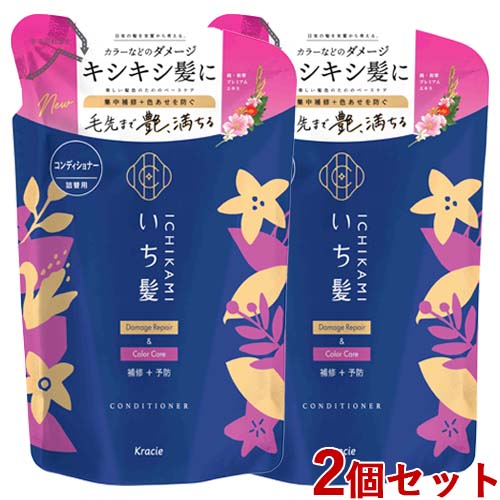 ダメージリペア & カラーケアコンディショナー詰替用。ダメージを集中補修 & 予防。ヘアカラーなどのダメージ、キシキシ髪のために。純・和草プレミアムエキス(補修 & 予防成分)。リビジュア & ベール成分。予防美髪:補修と予防。ダメージで失われたうるおいや艶を与え、閉じ込める。浮き毛やパサつきを整え、うるおいベールで守る。カラー褐色抑制処方、サルフェートフリー処方、硫酸系界面活性剤不使用。洗練された檸檬花と清らかな桜、七分咲きの香り。いち髪(Ichikami)/クラシエ株式会社[名称]コンディショナー[内容量]330g×2個