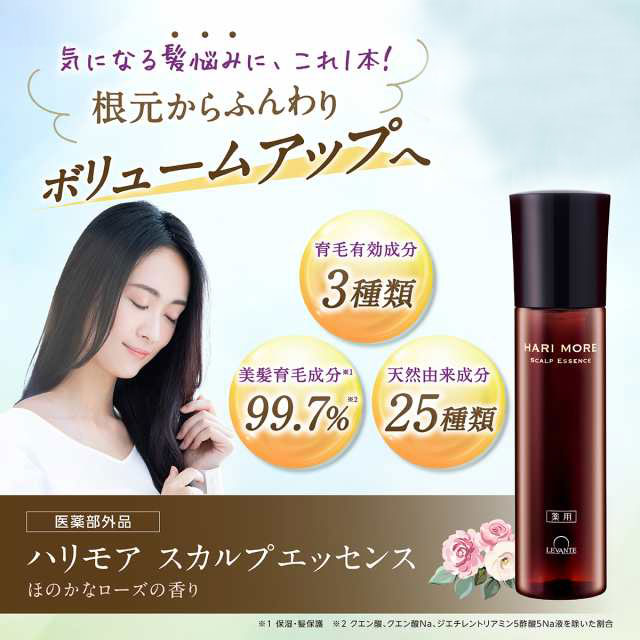 美容と育毛の融合スキンケアメーカー初の育毛エッセンス「薬用ハリモア」 ●モンドセレクション金賞受賞! [2016年] ●15種の無添加 ●25種類の天然由来成分 ●美容・育毛成分99.7%※(自社調べ) リッツシリーズを展開するスキンケアメーカー『レバンテ』が、 エイジングケア研究のノウハウを結集し開発したのが、女性の ための育毛剤『薬用ハリモア』です。加齢やカラーリング、 ストレスで乱れた頭皮環境を肌同様に美容成分で整えながら、 ハリ・コシのある美髪に導きます。多数の人気雑誌に紹介され、 口コミでも大変好評な商品です!