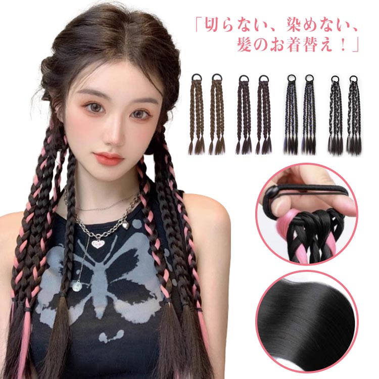 ■ポニーテール 付け毛 三つ編み 四つ編み 【2点セット】エクステ つけ毛 自然 ドレッド ウィッグ へアゴム 編み込み カラー エクステンシ