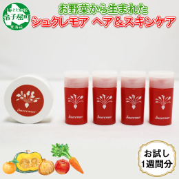 ■お野菜から生まれた「シュクレモア」 恵まれた大地「北海道」に感謝し、 さまざまな野菜を使ったスキンケアシリーズ「シュクレモア」が誕生。 野菜から美肌へ。 天然由来の美肌成分をたっぷりと取り入れました。 今回は1週間のトライアルセットをお届けします。 この機会に是非お試しください。 ■セット内容 オイルリッチクレンザー(グレープフルーツの香り) 「肌が潤い、使うたびに綺麗を実感」 肌の水分を逃さず保湿するオイルタイプのクレンジング。 てんさい糖の保湿力で、うるおいを守りながら汚れはしっかりと落とします。 パーフェクトローション 「潤いが肌に満ちていき、虜になる化粧水」 乾いた肌にぐいぐい浸透、たっぷりの栄養水がうるおいを与えます。 パーフェクトゲル 「保水・栄養・保護を兼ね揃えた