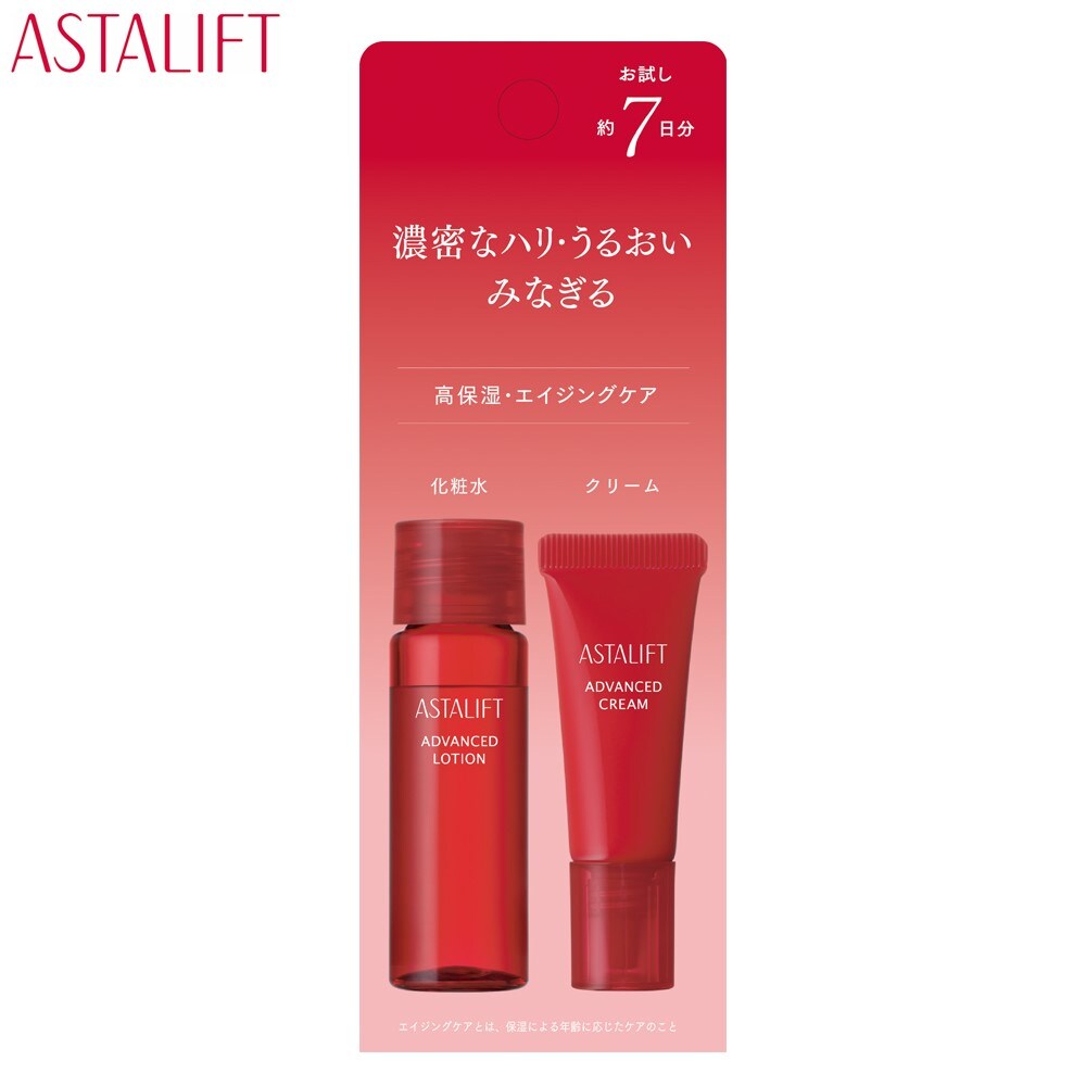 アスタリフトの高保湿・エイジングケア*1化粧水とクリームを約7日間試せるトライアルセット。ハリ肌印象の鍵は、「うるおい」×「つや」×「ふっくら感」。アスタリフト独自*2の「ナノアスタキサンチン*3」に加えて、厳選して配合した美容成分*4が肌に浸透*5。濃密にうるおって、ふっくら弾むようなハリつや肌へ。*1 年齢に応じたケア*2 独自技術でナノ化したこと*3 ヘマトコッカスプルビアリス油(ハリ保湿成分)*4 ハリ保湿成分:ワセリン、プテロカルプスマルスピウム樹皮エキス、トマト果実エキス。つや保湿成分:シロヤナギエキス。*5 角層までASTALIFT(アスタリフト)明日の美の向上を願って生まれたアスタリフトは、富士フイルムが培ってきた科学の力で、さまざまなエイジングの悩みに応える「サイエンスに裏付けられた」機能性化粧品シリーズ。独自のナノテクノロジーを駆使し、女性の願いに、科学の力で応えます。