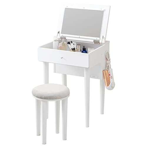 ■萩原 ドレッサー 化粧台 デスク コンセント付き スツール セット 天然木 フック付き モダン シンプル 幅50 奥行44.5 高さ39.5 ホワイト 1