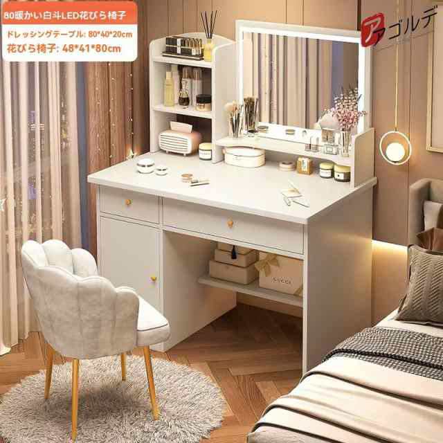 ■ドレッサー おしゃれ テーブル 安い 鏡台 椅子 スツール セット 収納 LED ライト デスク 化粧台80CM メイク コスメ かわいい 化粧 家具