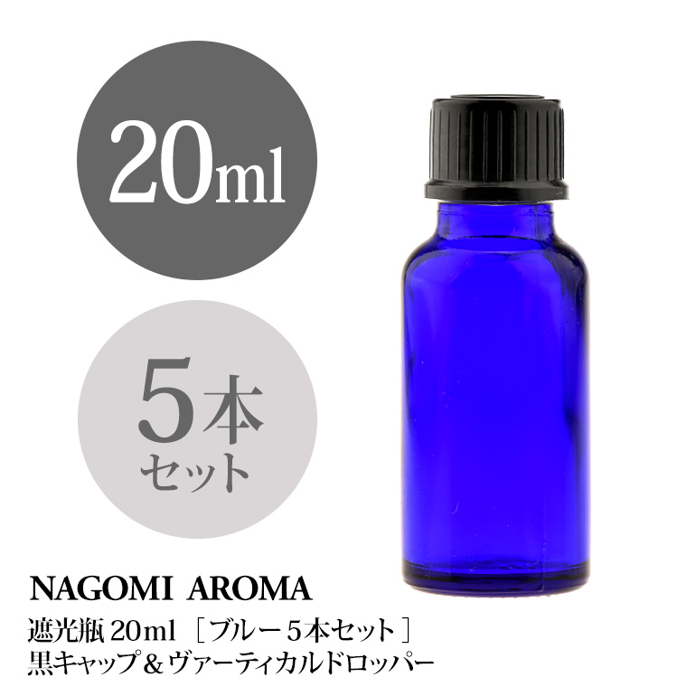 ■遮光瓶 20ml(ブルー) 5本セット 黒キャップ&ヴァーティカルドロッパー 瓶 遮光 青 容器 ビン 化粧水 コスメ ボトル 保存容器