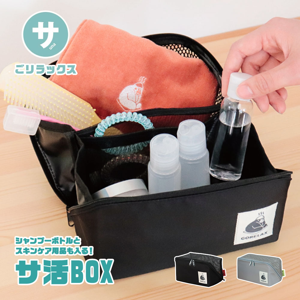 身も心もととのいます。噂のととのい系ブランド「ごリラックス」からサウナの後のスキンケアやヘアケアグッズが一式入るサ活BOXが登場!【ごリラックスとは】ごリラックスは、サウナをテーマに無口でシャイなゴリラのまもるさんが、いつもがんばっているあなたの心と身体を整えてくれる、ととのい系ブランドです。忙しい日々の中に、ごリラックスを。サウナや温泉の後に施設の洗面台を使うシーンスキンケアやヘアケアグッズって何かと必要ですよねいつものセットを持ってきたら何だかんだでごちゃごちゃで使いにくい…そんなお困りシーンないですか?歯ブラシ、歯磨き粉、ヘアブラシ、スキンケアボトル、コンタクトなどなどそんないつものアイテムが丸ごと収まって開けたらそのまま使えてしまう最強BOXが新しく発売される「サ活BOX」なんです!半分はメッシュになっているので、気になる濡れモノアイテムと仕分けて収納!仕切りはポーチになっているのでコンタクト系や綿棒入れるのもおすすめです【サイズ】約W180×H110×D110mm