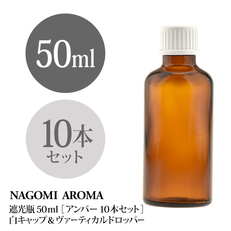 【特徴】遮光瓶(アンバー)にドロッパーと白キャップがついています。オイルの小分けや、ブレンド用に便利な遮光ビン・スタンダードなタイプのドロッパーと白いキャップのセットです。ガラス瓶の色は茶色(アンバー)で、遮光性が高く、シックな色合い。様々なシーンにマッチするので使いやすい色です。【商品スペック】産地:中国内容量:各50ml原材料:ガラス、プラスチックサイズ:瓶:H92mm×W37mm、キャップ:H15mm×W22mm、キャップ装着時:H94mmその他:[カラー]瓶:アンバー、キャップ:白[セット内容]瓶本体×10、ドロッパー&キャップ×10