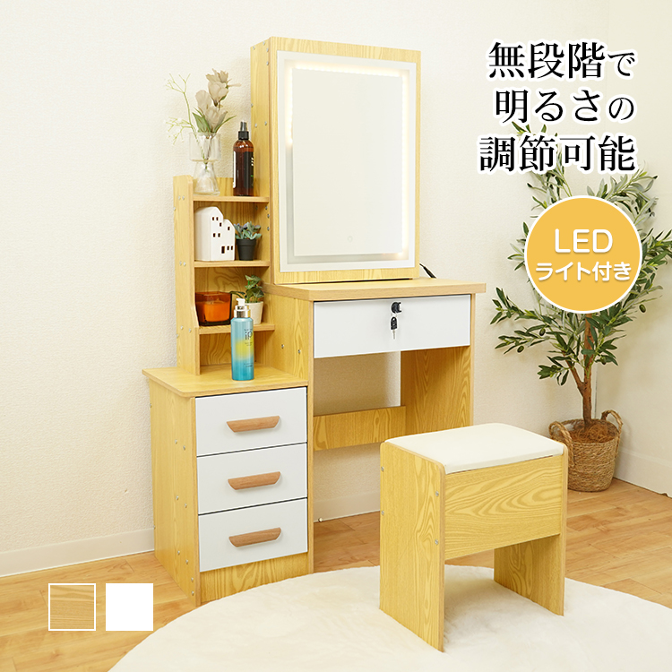 ■大きめミラーでメイクやヘアセットがしやすい ■LEDライト付きミラーではっきり見える ■明るさ無段階調整でお好みの明るさに ■充実の収納スペースでたっぷり収納 ■段差違いのテーブルで便利に使い分け 【商品内容】:LEDライト付き ドレッサー&チェアセット/ACアダプタ 【カラー】:ナチュラル/ホワイト 【サイズ】:(約)幅79.5cm×奥行36cm×高さ130.5cm 【USBケーブル長さ】:(約)1.5m 【重量】:(約)31kg 【材質】:MDF