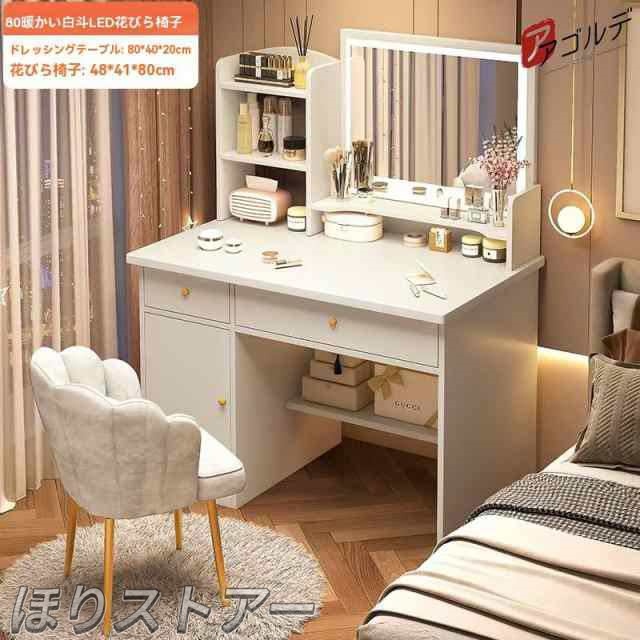 ■2023 最新型 ドレッサー おしゃれ テーブル 安い 鏡台 椅子 スツール セット 収納 LED ライト デスク 化粧台80CM メイク コスメ かわいい