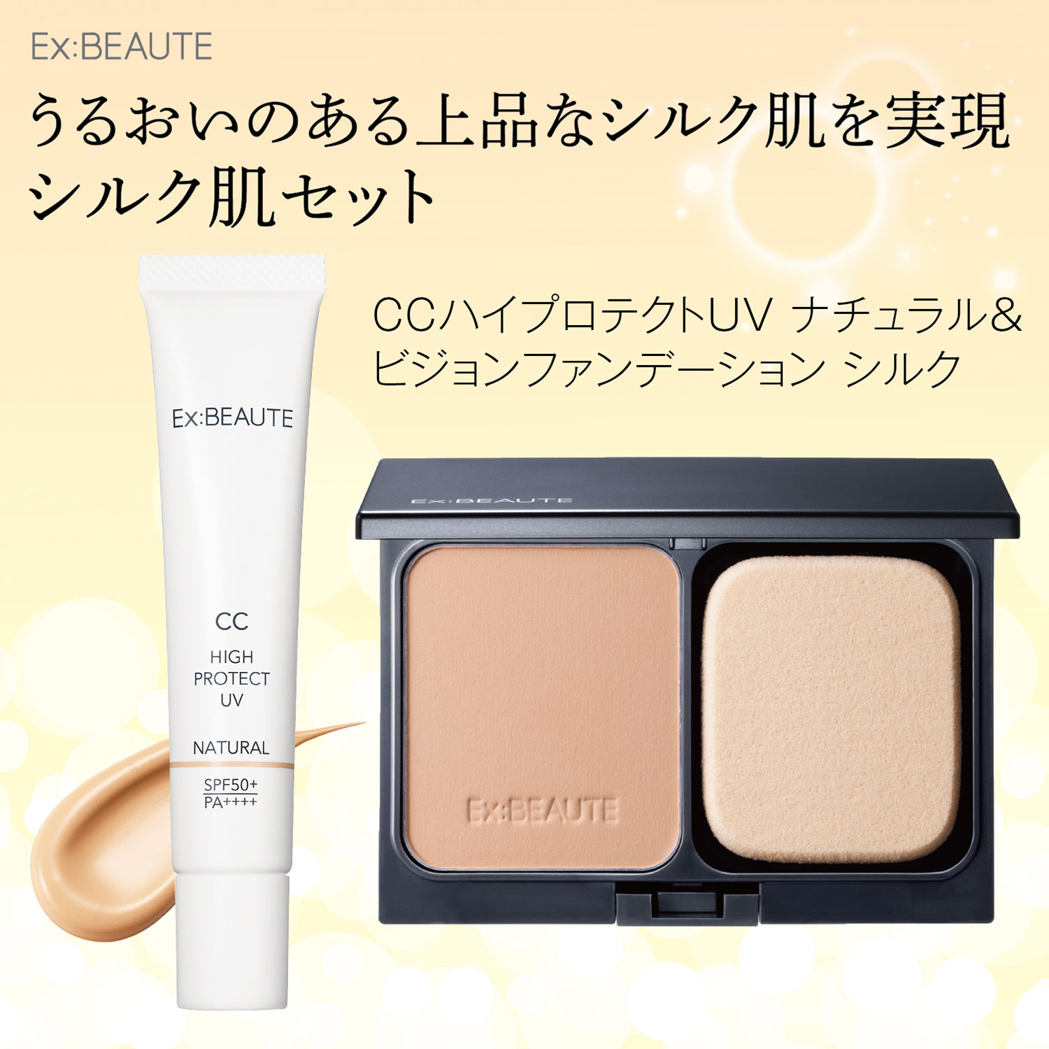 フワッとなめらかな"シルク肌"を演出する人気ファンデーションに、お得なセットが登場!「ビジョンファンデーション シルク」は、厳選した美容液成分を配合。ピタッと軽やかにフィット & カバーして、肌悩みを隠しながらつるんとなめらかな仕上がりをキープするパウダーファンデーションです。今回は通常別売の「ケース」と、優秀なメイク下地として名高い「CCハイプロテクトUV」をセットでお届け。CCハイプロテクトUVはSPF50+・PA++++の日焼け止め効果があり、1本でライトなベースメイクとしても活躍。あわせ使いなら、自然でありながら隙のない、ほんのりツヤ肌が長時間続きます。エクスボーテ素肌のような透明感(※)と高いカバー力を追求し、肌をキレイに魅せる2大テクノロジー発想のメイクシリーズ。紫外線をはじめとする外的刺激からの負担にも着目し、見た目だけでなく、心や生活まで心地よくするブランドへ進化しています。※メイクアップ効果による