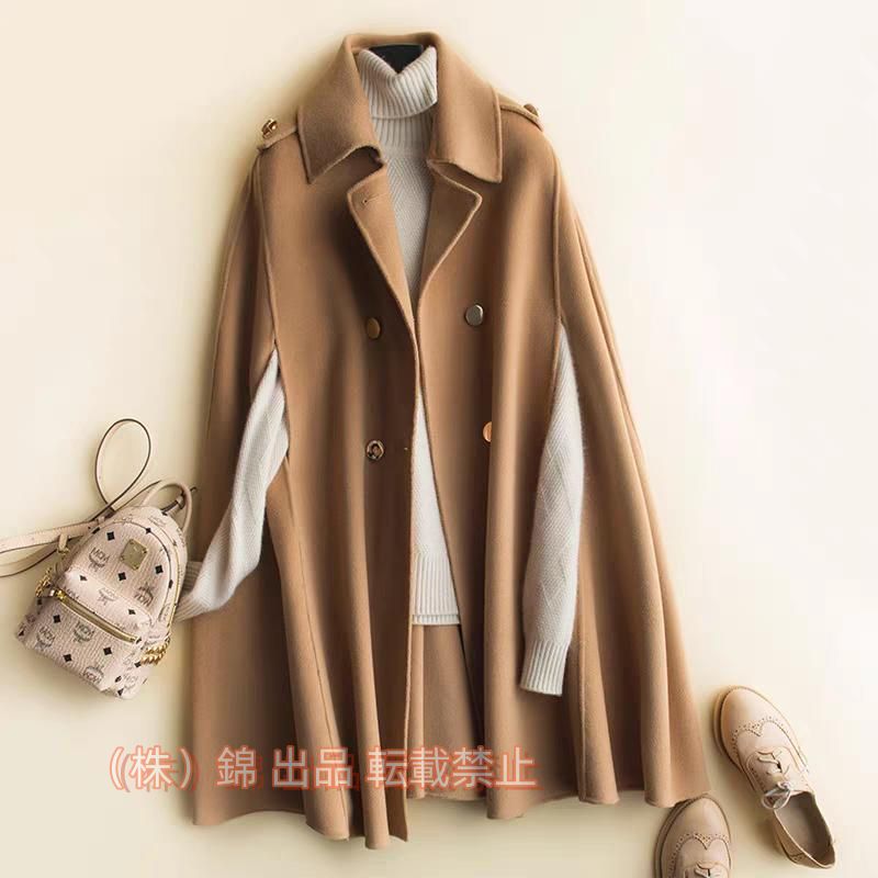 ■ウール100%ポンチョ マント リバーコート ダブルフェイス セレブ エレガンス ハーフコート株式会社錦 ベージュ 上品