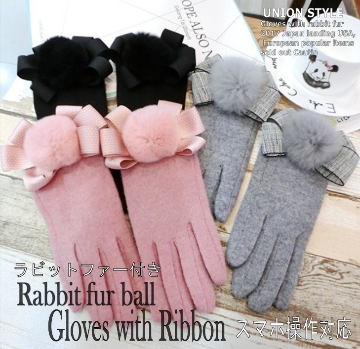 ■ラビットファー付き 裏起毛 ファーリボン付き 手袋 ニット グローブ エレガンス 暖かい 防寒 レイヤード 冬 レディース 04