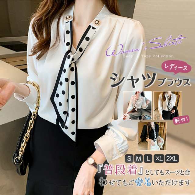 ■【ポイント10倍!】シャツブラウス レディース シャツ ボウタイ ドット柄 リボン 長袖 ゆったり 無地 エレガンス すべすべ 柔らかい 涼し
