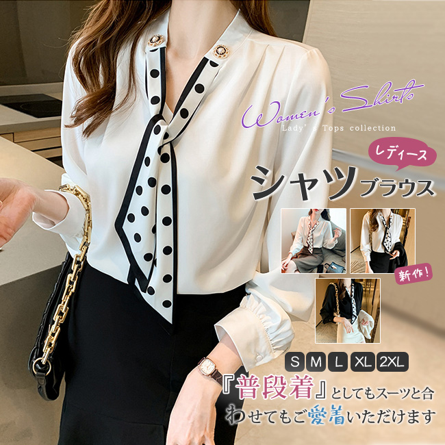 ■シャツブラウス レディース シャツ ボウタイ ドット柄 リボン 長袖 ゆったり 無地 エレガンス すべすべ 柔らかい 涼しい 体型カバー 学生