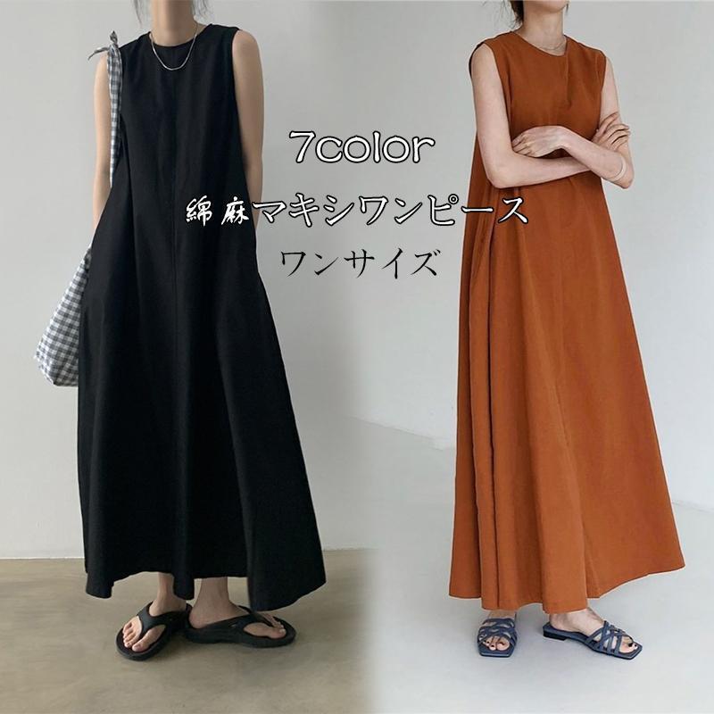 ■【ポイント10倍!】ワンピース ロングワンピース ロングワンピ ワンピ レディース マキシ丈 綿麻 無地 Uネック ノースリーブ ポケット 体