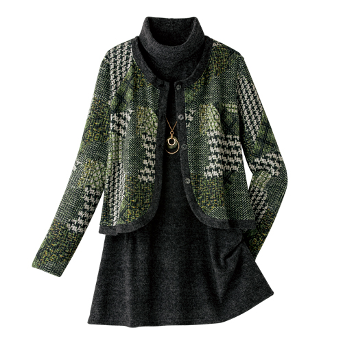 エレガンスデザインアンサンブル グリーン グレー トップス アンサンブル カーディガン カットソー チュニック レディース 婦人服 ミセス シニア 女性 チェック シニアファッション 50代 60代 70代 80代 母の日 お母さん おしゃれ 緑暖かな起毛素材のアンサンブル。カーディガンの上品な色柄が秋コーデに華やぎを映します。別々の着回しにも優秀。●素材/カーディガン:ポリエステル90%・レーヨン6%、ポリウレタン4%(ヨコストレッチ)、チュニック:ポリエステル85%・レーヨン10%・ポリウレタン5%(ヨコストレッチ)●仕様/カーディガン:前ボタン全開(4個)●中国製※カーディガンは裁断により柄位置が写真と異なる場合がございます。