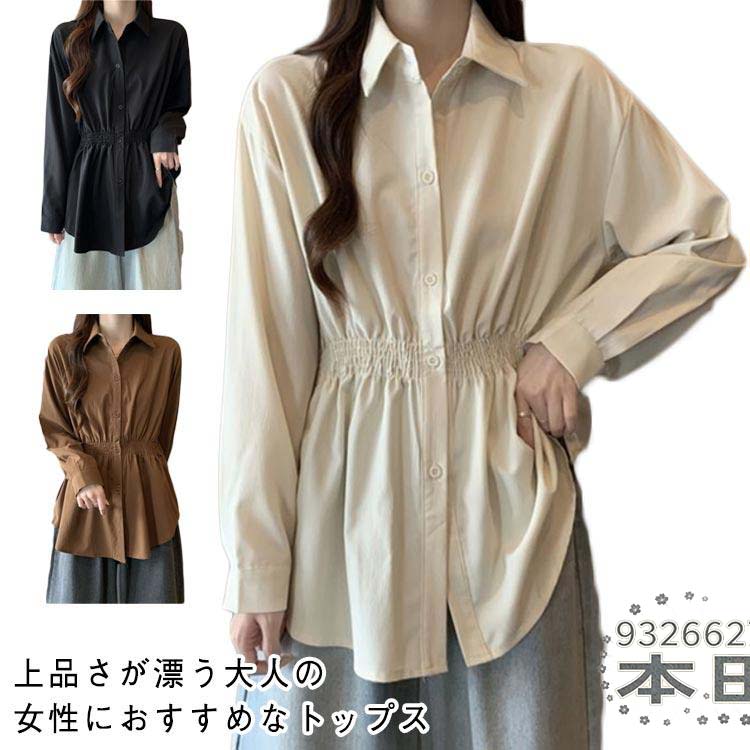 エレガンス トップス 秋口 シャツ ロング丈 上品 ウエスト絞り ギャザー フレア ブラウス キレイ目 フリーサイズ 春先 きれいめ レディース ビジ