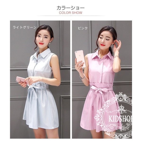 ■ワンピース ノースリーブ 着痩せ 膝丈 2色 ベルト付き 麻綿 シンプル シャツ Aライン フォーマル 二次会 通勤 OL エレガンス 無地 お呼ば