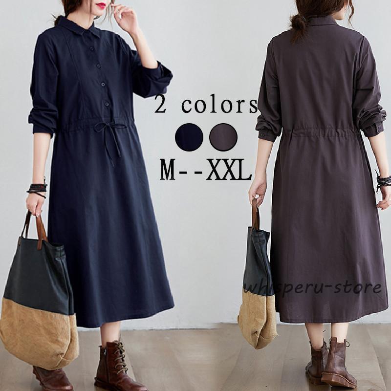 お呼ばれワンピースレディース 40代50代 秋冬シャツワンピース 長袖 披露宴 襟付き 大きいサイズ綿麻ワンピ可愛い エレガンス 着痩せ ゆったり