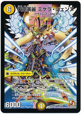 カード名:天空美麗 ミケラ・ジェンヌ カードの種類:エグザイル・クリーチャー 文明:光 ●レアリティ:レア ●パワー:6000 ●コスト:6 マナ ●マナ:1 ●種族:アウトレイジMAX ★特殊能力 ●このクリーチャーをバトルゾーンに出した時、自分のシールドをひとつ手札に加える。その後、自分の山札の上から1枚目を裏向きのまま、新しいシールドとして自分のシールドゾーンに加える。(このようにして手札に加えたシールドカードの「S・トリガー」を使ってもよい) ●W・ブレイカー(このクリーチャーはシールドを2枚ブレイクする) ●自分の他の、名前に《天空美麗》とあるエグザイル・クリーチャーをバトルゾーンに出すことはできない。