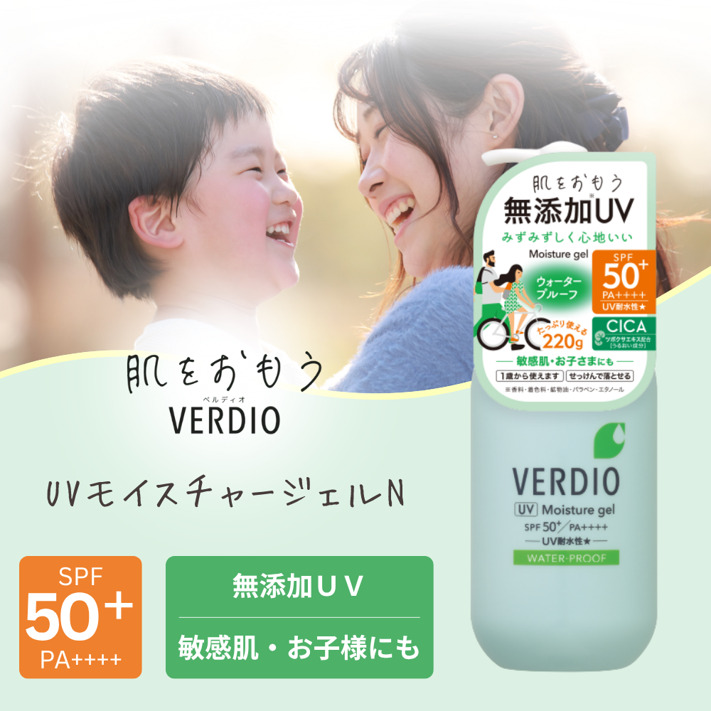 VERDIO ベルディオ UV モイスチャージェルN SPF50+ PA++++デリケートなお肌を紫外線からしっかり守るみずみずしくうるおい続くジェルタイプUV・お肌に優しい5つの無添加(香料・着色料・鉱物油・パラベン・ エタノール)・うるおい成分ツボクサエキス、ハトムギエキス、モリンガエキス、オウゴンエキス、エーデルワイスエキス配合。・外的刺激(紫外線・乾燥・花粉)をプロテクト。ウォータープルーフ。・低刺激処方。アレルギーテスト済み、パッチテスト済み。(※すべての方に刺激及びアレルギーが起こらないというわけではありません)◇検索関連ワード日焼け止め UVモイスチャージェル UVマイルドジェル クリーム ビオレ スプレー ニベア スティック アネッサ メンズ マスク ポンプ アリー 詰め替え トーンアップ 透明タイプ 乳液 安い ユースキン ウォータープルーフ 海 腕 近江 赤ちゃん アクア 紫外線吸収剤不使用 大容量 ドラッグストア ジェル 子供 こども 子ども キッズ クレンジング不要 石鹸で落とせる 敏感肌 贈り物 プレゼント ギフト 誕生日 記念日 お祝い お返し 母の日
