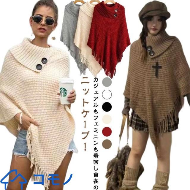 フリンジ プルオーバー レディース ケープニット セーター ケープ 折り襟 ニットセーター ストール フリンジ 体型カバー カジュアル おしゃれ