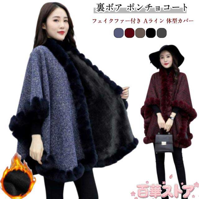フレア コート Aライン ケープ 裏ボア 体形カバー ポンチョ アウター マント 冬 ポンチョコート 暖か レディース ショール 秋 裏起毛 ふわふわ フェイクファー 防寒 大判 結婚式 大判ストール 20代 30代 40代
