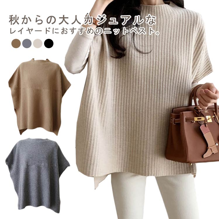 ■ニットベスト レディース トップス ポンチョ ケープ 半袖 五分袖 ドルマン スリット ラウンドネック ローゲージニット チャンキーニット