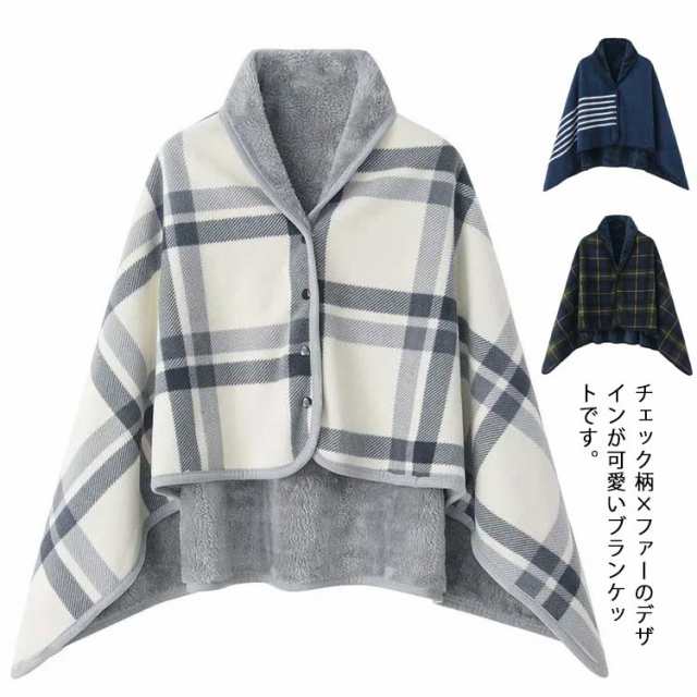 ストール ブランケット ひざ掛け 100*140cm ポンチョ マント ケープ 大判 裏起毛 レディース 男性 女性 冷え対策 モコモコ 着る毛布 チェック 北欧 あったか 厚手 暖かい 防寒 保温 オフィス 職場 ボタン