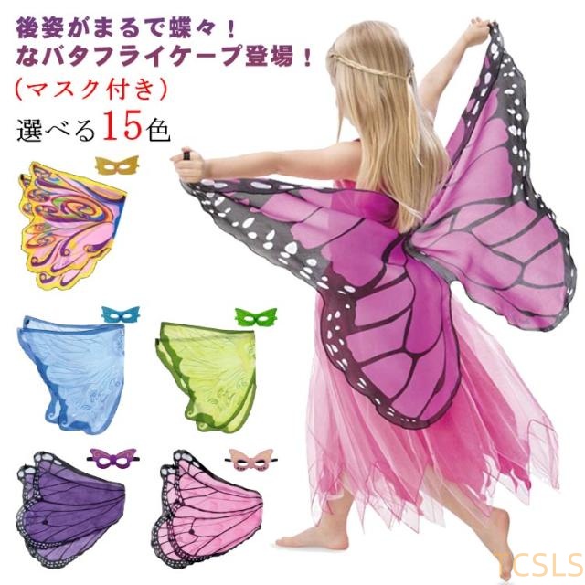 コスチューム バタフライケープ マスク付 子供用 キッズ 2点セット ケープ+マスク シフォン素材 コスプレ衣装 ハロウィン仮装 可愛い 全15色
