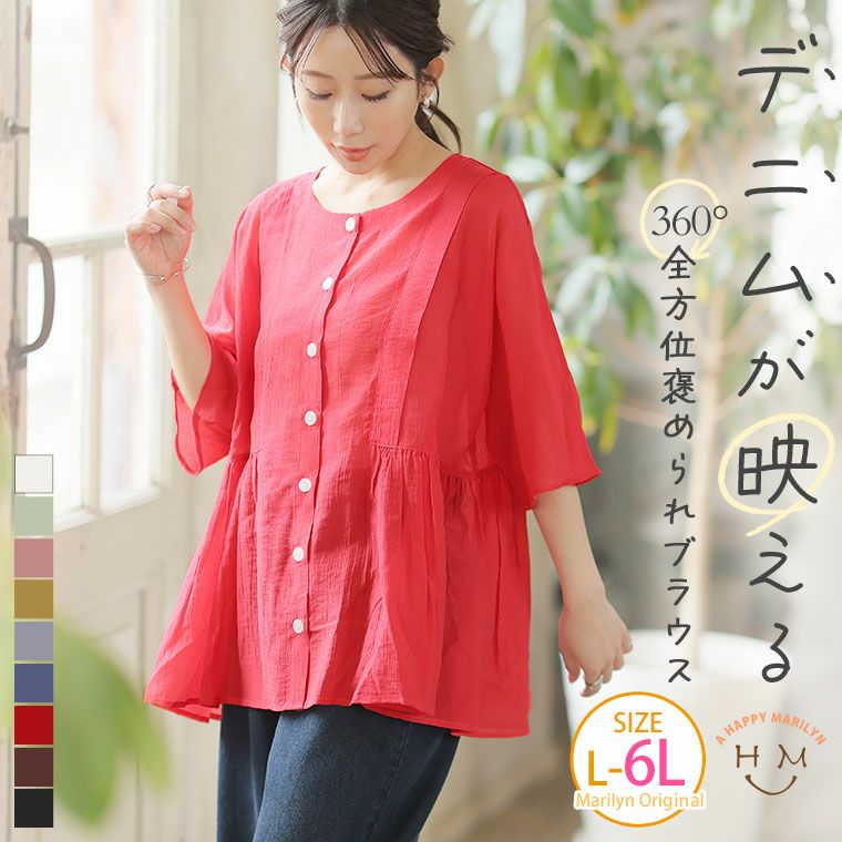 ■さらり涼し気 デニムが映える 楊柳シアー 華奢魅せ タックギャザー シャツ ブラウス 大きいサイズの通販ならハッピーマリリン(5900円以上購入で送料無料)