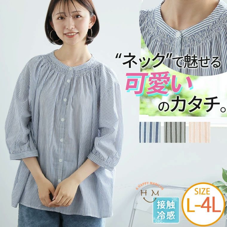 (5900円以上購入で送料無料)さらっと快適な着心地 襟ぐり シャーリング シャツ 通気性の良いひんやり心地良い接触冷感素材でデイリーに着たくなる!