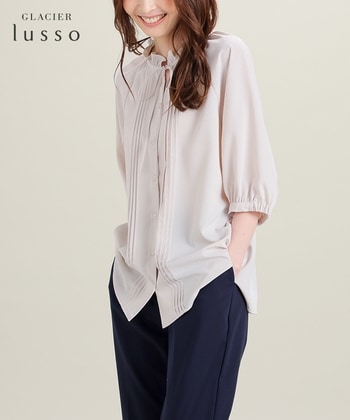 大人の主役トップス【デザイン】細かなピンタックと控えめなスタンドフリルに、コーデになじみやすい華奢なリボンタイが付いたフェミニンなデザイン。さりげない織り柄入りの素材感が上品な印象をプラス。体のラインを拾わないゆったりと腰回りが隠れる丈感。袖口の一部がゴム仕様で、袖丈の調節が可能。【素材・機能】滑らかで落ち感のあるドビー素材。【スタイル】ジャケットにも合うサイズ感で、テーパードパンツやフレアスカートと合わせたきれいめコーデにぴったり。ベストやカーデなどと合わせたレイヤードスタイルも◎ ●商品サイズ(cm)[S]バスト110・身丈64・裄丈55[M]バスト113・身丈65・裄丈57[L]バスト119・身丈66・裄丈58[LL]バスト125・身丈67・裄丈59※サイズにつきましては若干の誤差が生じる場合がございます。予めご了承ください。※モデル着用サイズ:Mサイズ※6分袖※後袖口部分ゴム ●品質/表地 ポリエステル 100%■カンボジア製 ●商品サイズ(cm)サイズ,バスト,身丈,裄丈S,110,64,55M,113,65,57L,119,66,58LL,125,67,59