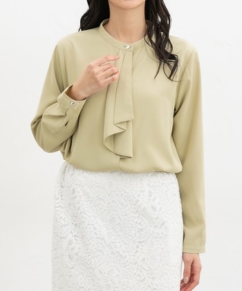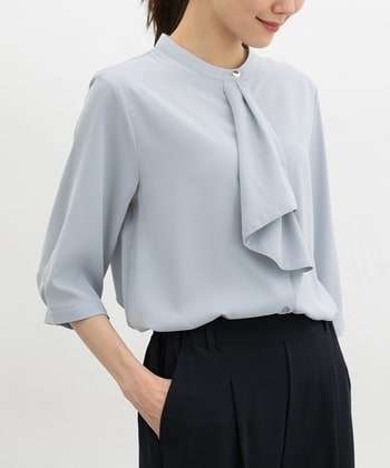 さりげなく華やかに【デザイン】結び直しの必要がない、流れるようなドレープが上品なボウタイデザイン。衿元のゴールドボタンがさりげないアクセント。バックにタックを入れた、体のラインを拾いにくく動きやすいゆったりめシルエット。自分にぴったりが見つかる、S~3Lまで揃った豊富なサイズ展開。【素材・機能】環境に優しい再生ポリエステルを使用した、滑らかで落ち感のある素材。【スタイル】ジャケットにも合うサイズ感で通勤や入学式・卒業式などのセレモニーシーンにも使え、テーパードパンツやフレアスカートと合わせたきれいめスタイルに大活躍。デニムと合わせてカジュアルダウンさせるのも◎ ●商品サイズ(cm)[S]バスト102・身丈59・袖丈54・肩幅37[M]バスト105・身丈60・袖丈55・肩幅38[L]バスト111・身丈61・袖丈55・肩幅39[LL]バスト117・身丈62・袖丈56・肩幅41[3L]バスト123・身丈63・袖丈55・肩幅42※サイズにつきましては若干の誤差が生じる場合がございます。予めご了承ください。※モデル着用サイズ:Mサイズ ●品質/表地 ポリエステル 100%■ミャンマー製 ●商品サイズ(cm)サイズ,バスト,身丈,袖丈,肩幅S,102,59,54,37M,105,60,55,38L,111,61,55,39LL,117,62,56,413L,123,63,55,42