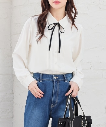 大人にこそ似合う「進化系カジュアル」いつものカジュアルスタイルに今年らしさを加えるなら、さりげない"大人の遊び心"で差をつけたい。抜け感と品を両立した"大人の進化系カジュアル"が、春の装いを軽やかにアップデートします。春らしいマーガレットの刺しゅうが大人の可愛げあふれるオーバーサイズのボウタイつきデニムシャツ。タックを入れた袖のボリューム感が、着映え効果たっぷり。ボウタイを外せばマニッシュな表情に。ゆとりあるサイズ感でインにもアウトにも着回せます。