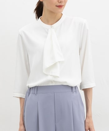 さりげなく華やかに【デザイン】結び直しの必要がない、流れるようなドレープが上品なボウタイデザイン。衿元のゴールドボタンがさりげないアクセント。バックにタックを入れた、体のラインを拾いにくく動きやすいゆったりめシルエット。ジャケットの袖口から見えない6分袖。自分にぴったりが見つかる、S~3Lまで揃った豊富なサイズ展開。【素材・機能】環境に優しい再生ポリエステルを使用した、滑らかで落ち感のある素材。【スタイル】ジャケットにも合うサイズ感で、テーパードパンツやフレアスカートと合わせたきれいめお仕事スタイルに大活躍。デニムと合わせてカジュアルダウンさせるのも◎ ●商品サイズ(cm)[S]バスト102・身丈59・袖丈36・肩幅37[M]バスト105・身丈60・袖丈37・肩幅38[L]バスト111・身丈61・袖丈37・肩幅39[LL]バスト117・身丈62・袖丈38・肩幅41[3L]バスト123・身丈63・袖丈37・肩幅42※サイズにつきましては若干の誤差が生じる場合がございます。予めご了承ください。※モデル着用サイズ:Mサイズ※6分袖 ●品質/表地 ポリエステル 100%■ミャンマー製 ●商品サイズ(cm)サイズ,バスト,身丈,袖丈,肩幅S,102,59,36,37M,105,60,37,38L,111,61,37,39LL,117,62,38,413L,123,63,37,42