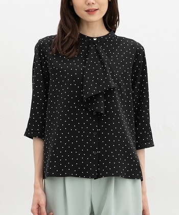 《 "セレモニースタイル" ハレの日はもちろんオフィスにも着回せる♪衿元のボウタイが華やかな印象のキレイめブラウス 》【ポイント】 ・さりげないドット柄でフェミニン感をプラス ・使いやすい黒とアイボリーの2色展開、着回し力も抜群! 【デザイン】 ・ドレープデザインが、上品且つ柔らかい印象を演出 ・前身のタック&フリルで顔まわりを華やかに見せ、写真映えも◎ 【素材】 ・軽やかなシフォン素材で、柔らかく快適な着心地 ・ほんのり透け感のあるドット生地が女性らしさを引き立てます 【コーディネー…■品質/(表側)ポリエステル100% (裏側)ポリエステル100%