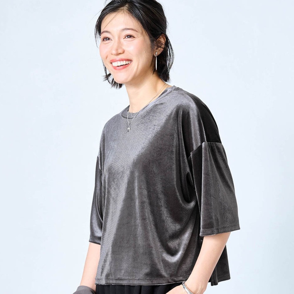 ―デザイン・スタイリング―・身体のラインを拾いにくいワイドシルエット・体型が気になる方も一枚で着こなしやすいTシャツ・ひじまで隠れる五分袖で気になる二の腕をカバー・ベロアの風合いが際立つシンプルなデザイン・深めのサイドスリットや襟元の切り替えでこなれ感をプラス―素材―・上品な質感のベロア生地・肌面はフラットでやわらかな感触Style Note(スタイルノート)2000年のデビュー以来、長きにわたりご好評を頂いている ベルメゾンのオリジナルブランド。トレンドを適度に取り入れながら、素材・仕立て・シルエットに至るまで、大人の女性にふさわしいクオリティを追求し、お洒落が楽しくなるスタイルをお届けします。