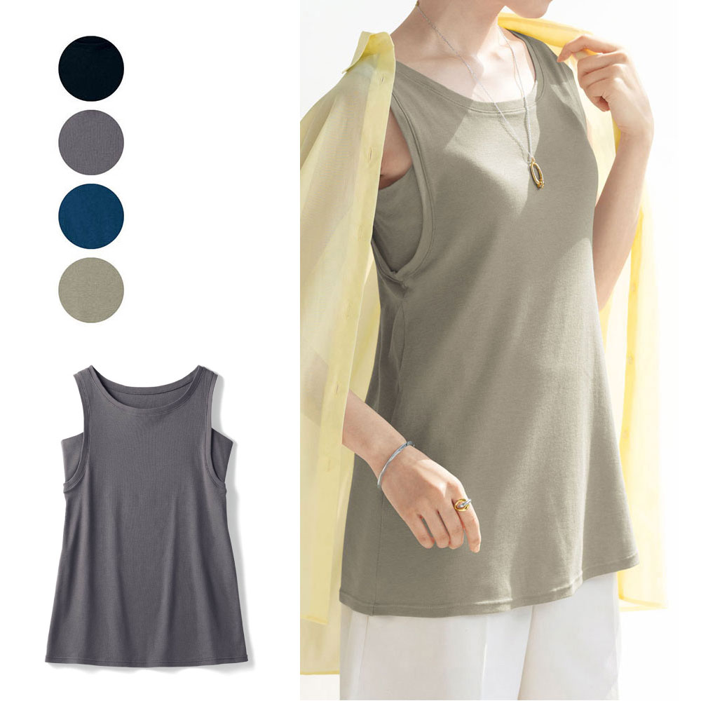 1枚でおしゃれ見えとお悩み対策を叶えるトップスゆったりシルエットのロング丈 & Aラインでお腹周りとヒップをカバー胸もとは高めラインでチラ見えカバーインにビスチェを着たようなパターンで脇下をカバー肌に心地よい綿混素材透け感のあるシャツやトップスを着る時、下に重ねるのにちょうどいいアイテムが見当たらないとお困りではありませんか?このトップスなら、大人の夏おしゃれで気になる、胸もと・脇下・お腹まわりの「危険ゾーン」をしっかりカバー。スタッフが試着を繰り返して調整したこだわり設計で、ストレスなく夏おしゃれが楽しめます。上品に見えて着回しやすい色をご用意。毎日のコーデにぜひお役立てください!※サイズ表記()内の数字はヌード寸法です