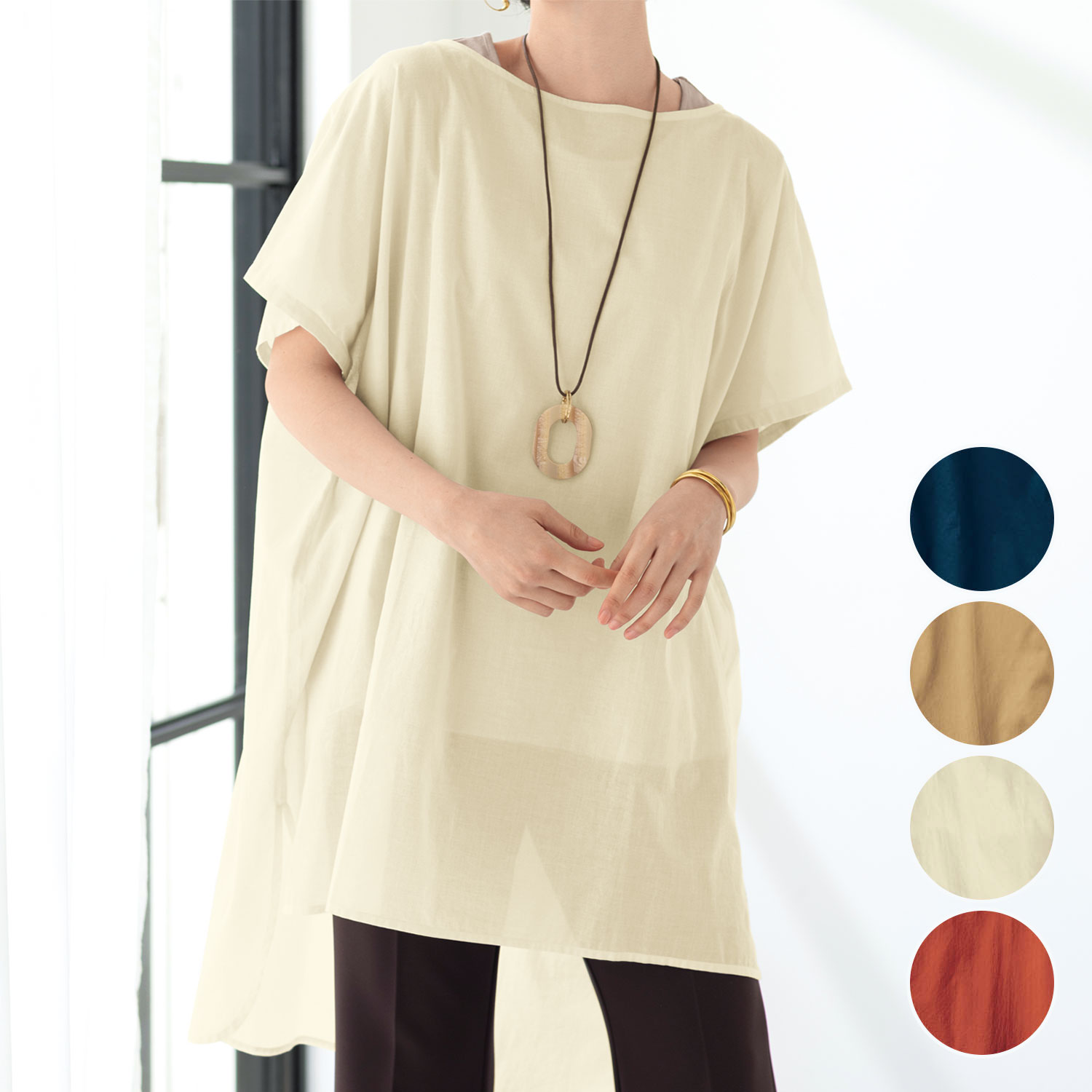 ―デザイン・スタイリング―・一枚でも重ね着でもきれいに映える、 計算された丈とシルエット・腰まわりをカバーする長め丈で、両脇スリット入り・襟元が開きすぎないボートネックが上品・脇にマチ付きなので、脇の下やインナーが見えにくい・ゆったりとしたサイズ感で気になる体型のカバーにも―素材―・表面の毛羽をなくすシルケット加工をかけた 綿100%スムース素材・なめらかできれいな風合いが魅力
