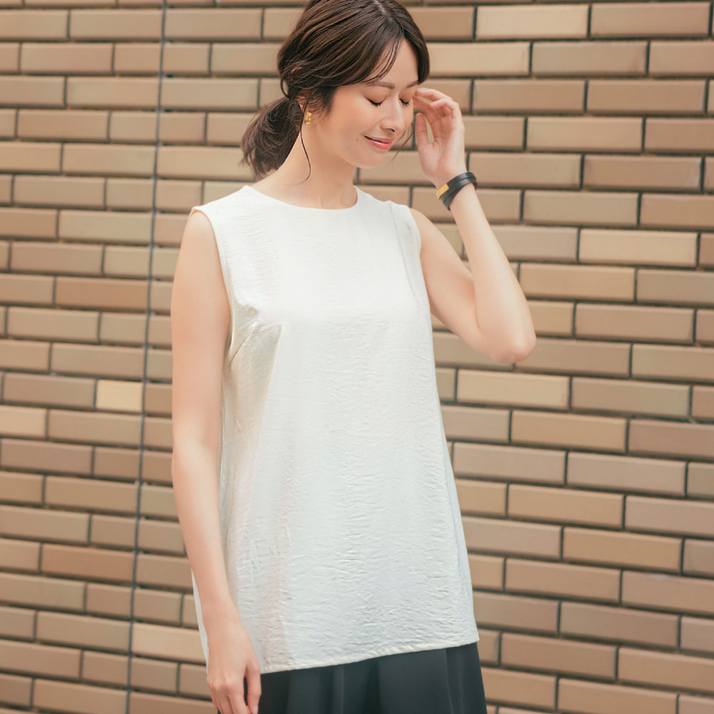 ーデザイン・スタイリングー・後ろ丈を長めにして腰まわりをカバー・女性らしさを引き立てる裾の丸み・ほどよく詰まったネックで首元を上品にー素材ー・表面の毛羽を無くすシルケット加工で艶やかな風合い・綿100%素材なので肌あたりがやさしい・肌に触れた瞬間にひんやり感じる接触冷感機能