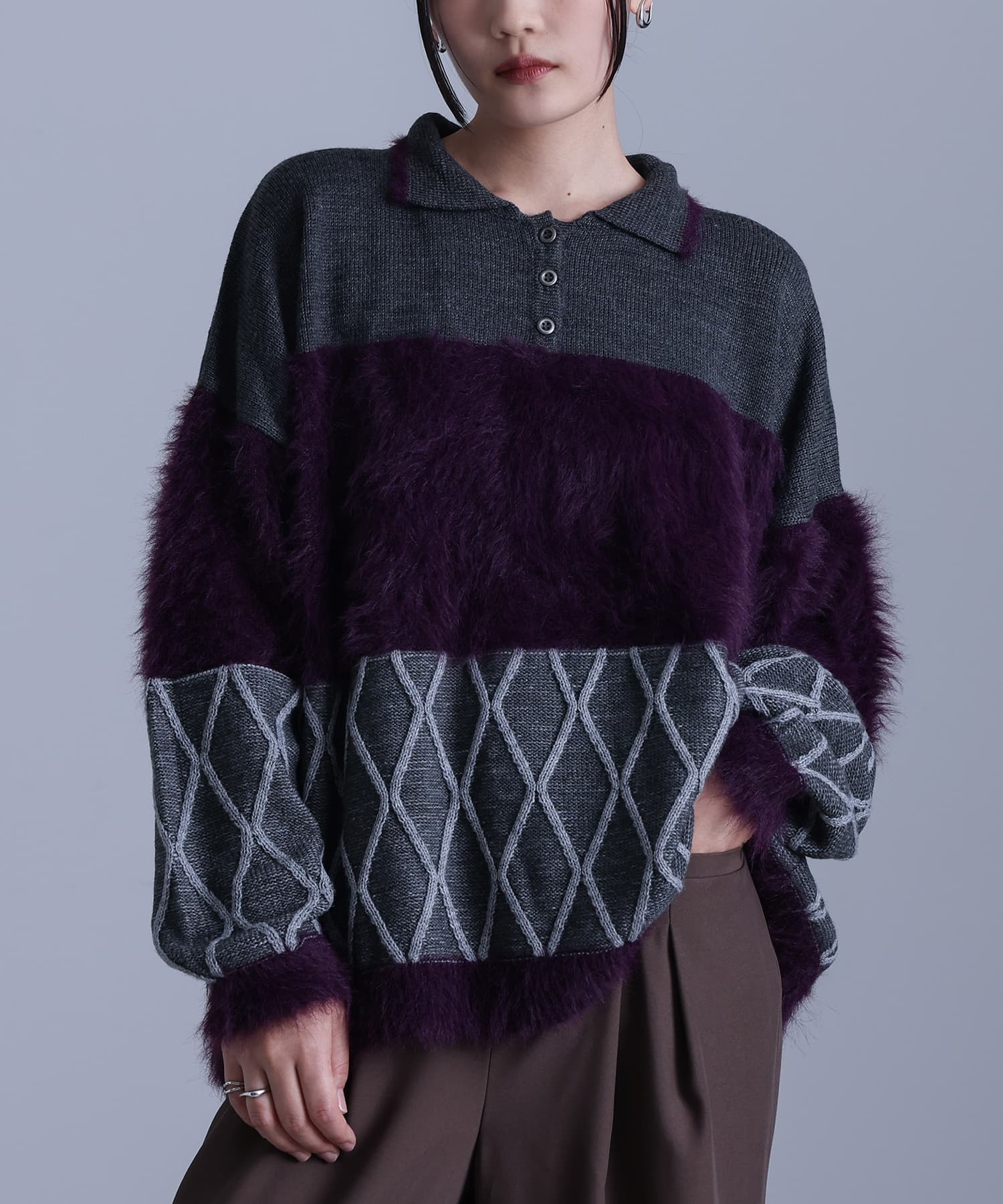 デザイン無地とシャギー糸、ダイヤ柄を切り替えたポロシャツ型のニット。柄部分は2色の糸を使用し、立体的に仕上げました。配色のシャギー部分はしっかり毛足のある糸で価値を出し、襟の端にもライン状に入れてポイントに。ボタンはマットシルバーで、細部までこだわったモードなアイテムです。 コーディネート配色感のあるデザインなので、無地のボトムスと合わせるのがおすすめ。女性らしいスカートでバランスをとったり、ワイドパンツとブーツでかっこよく決めても デニムやスニーカーでカジュアルにまとめてもお洒落に仕上がります。 素材無地部分はさらりとした肌触りの天竺編みで、柄部分は表面感のある立体編み、シャギー部分はふわふわな肌触りのニット生地の組み合わせ。程良い厚みで、肌寒い季節にに活躍するアクリルニットです。 製品についての注意書きニット製品につきまして。ニット素材の持つ特性として編