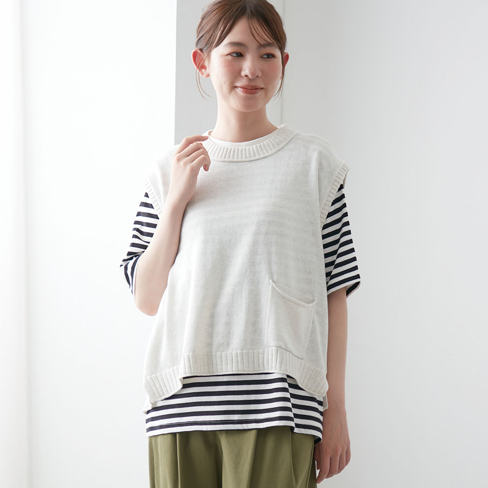 ーデザイン・スタイリングー・別々にも使えるニットベスト×カットソーのアンサンブル・大人のカジュアルスタイルにマッチ・これがあるだけでコーディネートの幅が広がる・カットソーは袖口が長めなので二の腕が気にならない・ニットベストは小さなポケットがアクセントー素材ー・Tシャツはさらっとした肌触りの素材、ニットベストは柔らかくて着心地のいい素材