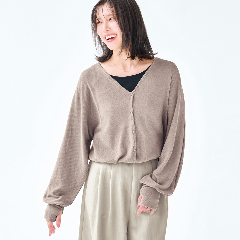 ―デザイン・スタイリング―・寒さや紫外線が心配な日など、寒暖差が激しい季節に活躍・ニットのようなカットソーカーディガン・トレンドのショート丈で色んなボトムと好相性・ドルマンスリーブと裾ゴムのふっくらとしたシルエット・Vネックで首元をすっきりとした印象に―素材―・もちっとしてやわらかく軽い着心地のカットソー素材ロウイング/Rowing2025年デビューの、ベルメゾンオリジナルのファッションブランド。最近カジュアルがなんだかしっくりこないという大人に向けて、素材・サイズ感・デザインにこだわった、無理せず着られる大人のための等身大服をお届けします。