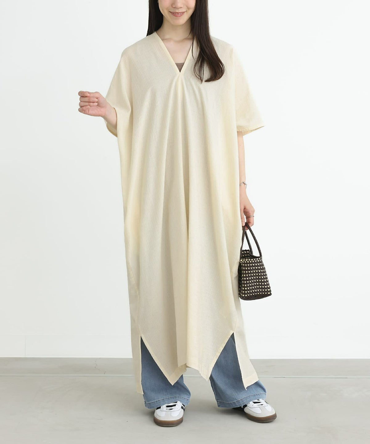 デザイン落ち感のあるシルエットと深めのVネックが女性らしさを惹き立てるカフタンワンピース。四角い形が、着用すると独特の落ち感を生み、リラックスした着心地のアイテムです。裾スリットで抜け感をプラス 便利なシームポケット付き。 素材コットン混のさらりとした肌触りの生地。表面感のある生地を使用し、シンプルでも表情豊かなデザインに。 淡色は透け感がございますのでインナーのご着用をおすすめいたします。 コーディネートワイドパンツと合わせた大人カジュアルな着こなしがおすすめです。タンクトップやキャミソールをレイヤードして、Vネックからちらりと覗かせても スタッフ試着データ【フリーサイズ】袖丈:ちょうどひじ位着丈:くるぶし上5cm位腕周り:大きいバスト:大きいウエスト:大きいヒップ:大きい全体:大きい全体的に大