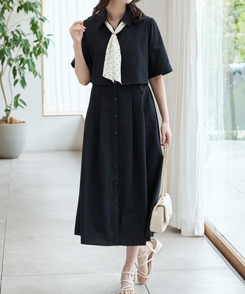 人気スタッフとコラボ!【デザイン】スタッフスタイリング年間売り上げ上位の人気スタッフと作ったコラボアイテム。クロップドシャツとロングスカートをレイヤードしたような着こなしが1枚で楽しめ、時短も叶う上品デザイン。きちんと見えと清潔感が魅力。首元をすっきりと見せてくれるスキッパー衿で涼しげな印象に。長めの半袖で気になる二の腕もカバー。【素材・機能】程よいハリがありシワになりにくい素材。下身頃には透けが気にならない裏地付き。後ろウエストゴムでストレスフリーな着心地。便利な両サイドポケット付き。【スタイル】1着ではもちろん、カーディガンやジャケットを合わせればロングシーズン活躍。●スタッフコラボラインナップ・オフショル2wayブラウス(品番:4570640240)・UVカットパーカー(品番:5850129848)・スカラップ刺繍ブラウス(品番:5340630245)・ラッフルフリルブラウス(品番:5340630246)・シャツワンピース(品番:4570529426)※時期により未販売または売り切れの場合がございます。 ●商品サイズ(cm)[S]バスト99・身丈116・袖丈28・肩幅35・ウエスト75・ウエスト最大伸89[M]バスト102・身丈118・袖丈29・肩幅36・ウエスト78・ウエスト最大伸92[L]バスト108・身丈119・袖丈30・肩幅37・ウエスト84・ウエスト最大伸98[LL]バスト114・身丈121・袖丈30・肩幅39・ウエスト90・ウエスト最大伸104※サイズにつきましては若干の誤差が生じる場合がございます。予めご了承ください。※モデル着用サイズ:Mサイズ※ウエスト最大伸は生地の伸び分を除く※後ウエスト部分ゴム ●品質/表地 ポリエステル 100%・裏地 ポリエステル 100%●裏地/下身頃のみあり■ミャンマー製※上身頃のみ二枚仕立て ●商品サイズ(cm)サイズ,バスト,身丈,袖丈,肩幅,ウエスト,ウエスト最大伸S,99,116,28,35,75,89M,102,118,29,36,78,92L,108,119,30,37,84,98LL,114,121,30,39,90,104