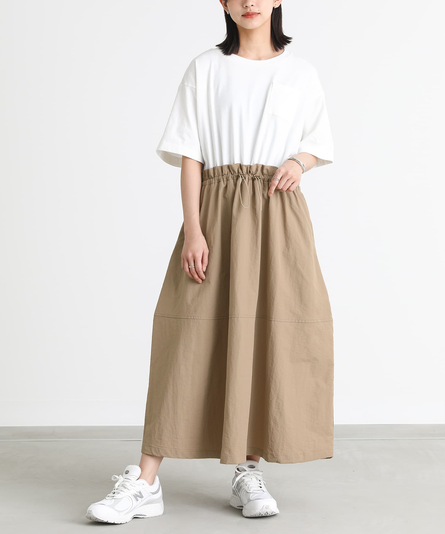 デザイン異素材ドッキングの配色ワンピース。ウエスト部分は平ゴム入りで、ややギャザーが寄った状態。ドローストリングでシルエットの変化を楽しめます。スカートは少しコクーンシルエットになっており、大人っぽくご着用いただけます。 素材身頃は肌触りの良い天竺生地。スカート部分はシャカシャカとしたナイロン素材で、ミリタリーテイストのある生地です。裏地は付いておりません。 カットソー部分はやや透け感がございますのでインナーのご着用をおすすめいたします。 ディテール・両脇シームポケット・胸ポケット・ウエスト部分は平ゴム 丸紐ゴム入り。ストッパー金具で調整可能。 コーディネートキャップやスニーカー、サンダルなど小物でアレンジを加えてカジュアルスタイルをお楽しみいただけます。 スタッフ試着データ【1(M~L)】袖丈:ちょうどひじ位着丈:くるぶし上7cm位腕周