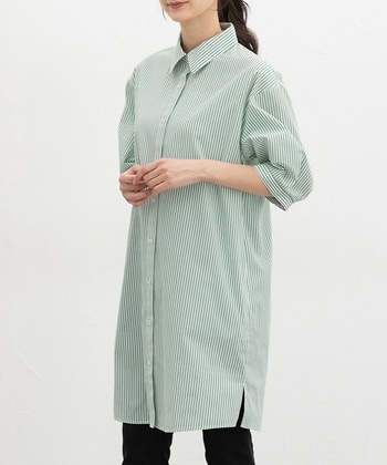 幅広い着こなしに【デザイン】ベーシックなレギュラーカラーの、シンプルで合わせやすいデザイン。体のラインを拾わない、ゆったりとしたシルエット。低身長さんにもうれしい、やや短めの丈感。ロングシーズン使える6分袖。【素材・機能】さらっとしてシワになりにくい綿混素材。便利な両サイドポケット付き。【スタイル】パンツとのレイヤードスタイルがおすすめ。羽織りとしても使え、幅広い着回しに活躍。 ●商品サイズ(cm)[M]バスト110・身丈92・袖丈31・肩幅49[L]バスト116・身丈93・袖丈32・肩幅50[LL]バスト122・身丈95・袖丈32・肩幅52※サイズにつきましては若干の誤差が生じる場合がございます。予めご了承ください。※モデル着用サイズ:Mサイズ※6分袖 ●品質/表地 ポリエステル 65%・綿 35%●裏地/なし■ミャンマー製※裾両脇スリットあり(10cm) ●商品サイズ(cm)サイズ,バスト,身丈,袖丈,肩幅M,110,92,31,49L,116,93,32,50LL,122,95,32,52