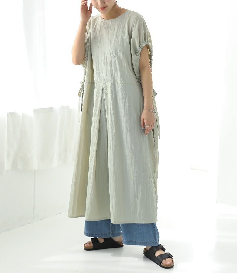 デザインサイドのリボンアレンジで表情が変わり、シンプルながらも個性を引き立てるワンピース。大人らしいナチュラルな雰囲気をお楽しみいただけます。子供っぽくならず洗練された印象を与え、便利なポケットもついているので、どんなシーンにもぴったりの一着です。 コーディネートカジュアルなスニーカーを合わせて、リラックスしたデイリースタイルに。オンスタイルには、きれいめなヒールやローファーを合わせると、洗練された大人の雰囲気に仕上がります。 素材シャカシャカとした触り心地のナイロン100%素材を使用。薄手の生地感で、軽やかな着心地を実現します。 サイズM~L 着丈118cm 裄丈36cm 袖口周り64cm バスト144cm ウエスト164cm ヒップ176cm 裾周り194cm 採寸位置について 詳しくはこちら≫ 詳細データ 重量約225g 生