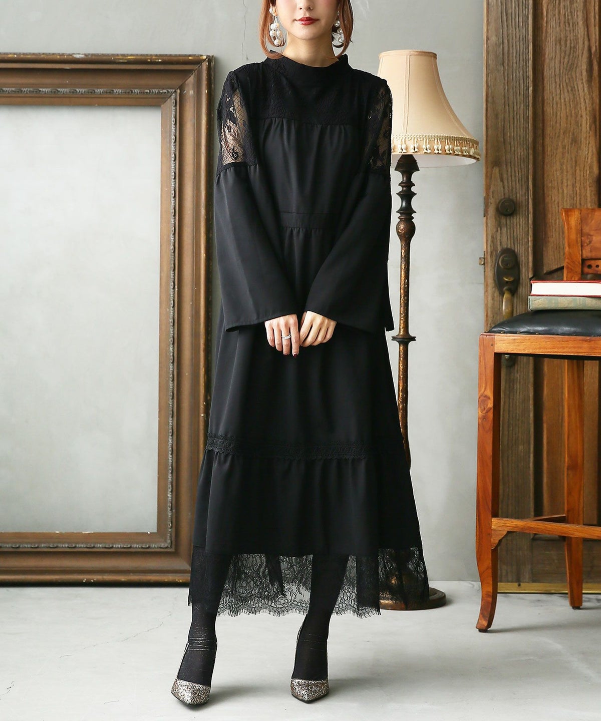 ■レース切替ティアードワンピース 洗える 洗濯可能 セレモニー 結婚式 パーティー 1(M~L) ブラック